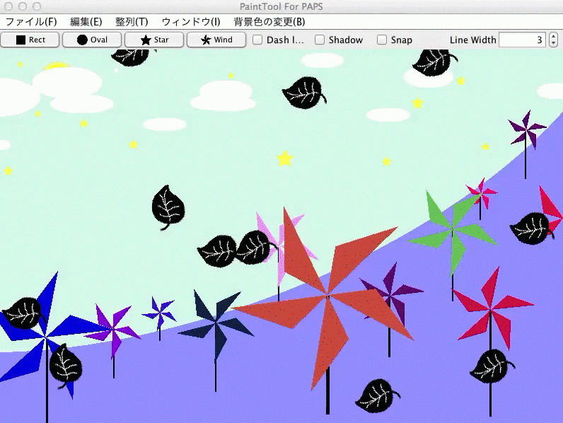 オブジェクト指向プログラミング言語 Java を用いた、 2Dドローソフトウェアの作成を行います。